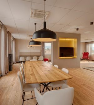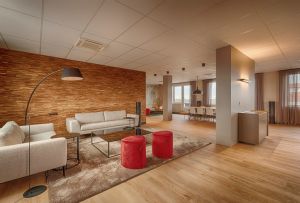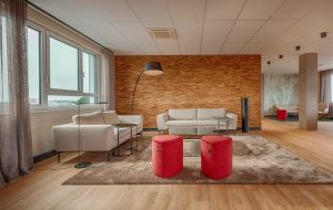 - Ausschließlich Einzel- und Doppelbüros mit viel Glas und Holz schaffen eine angenehme Arbeitsumgebung.