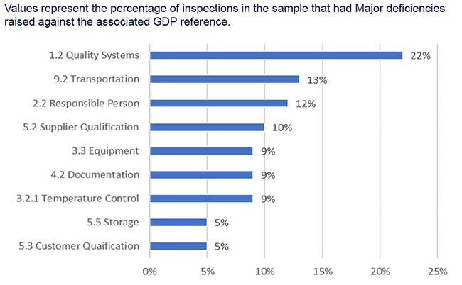 Wie bei den meisten GMP-Fehlerübersichten steht auch hier "Quality Systems" ganz oben auf der Liste, Es folgen jedoch zwei typische GDP-Themen: "Transportation" und "Responsible Person":