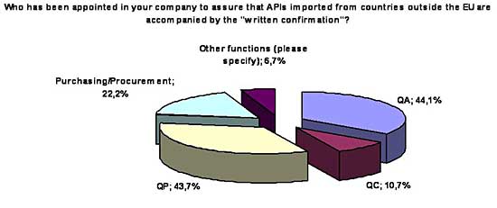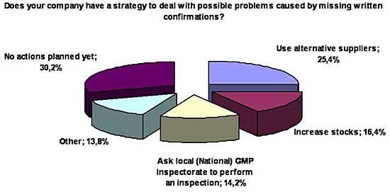 Zum Zeitpunkt der Umfrage antworteten knapp 50% der Unternehmen , dass sie schon versucht haben, eine Written Confirmation zu bekommen für Wirkstoffe, die außerhalb der EU hergestellt werden. Diese Zahl kann mittlerweile höher sein. Nur 15% glaubten, dass ihre Firma die Written Confirmation für alle importierten Wirkstoffe bis zum 2. Juli 2013 bekommen werden, wogegen 35% dies eher nicht glaubten. Für die restlichen war es noch zu früh, um diese Frage zu beantworten.
