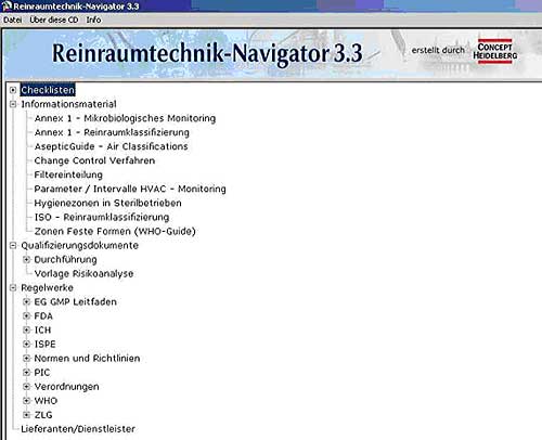 Die CD ist ein Werkzeug, um schnell und problemlos die wichtigsten Anforderungen nachzuschlagen und um in Praxisbeispielen Ideen für die tägliche Arbeit im Bereich der Reinraumtechnik zu finden. Die Informationen sind in folgender Baumstruktur gegliedert: