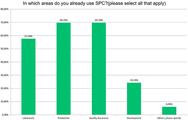 Einsatzgebiet von SPC: Spannend wurde es bei der Frage, in welchen Bereichen SPC eingesetzt wird? (Mehrfachnennungen waren möglich). Hier haben jeweils 70 % den Produktionsbereich und den Bereich Qualitätssicherung angeben. 58% gaben den Labor-Bereich, mit etwas Abstand folgt der Entwicklungsbereich (24%).